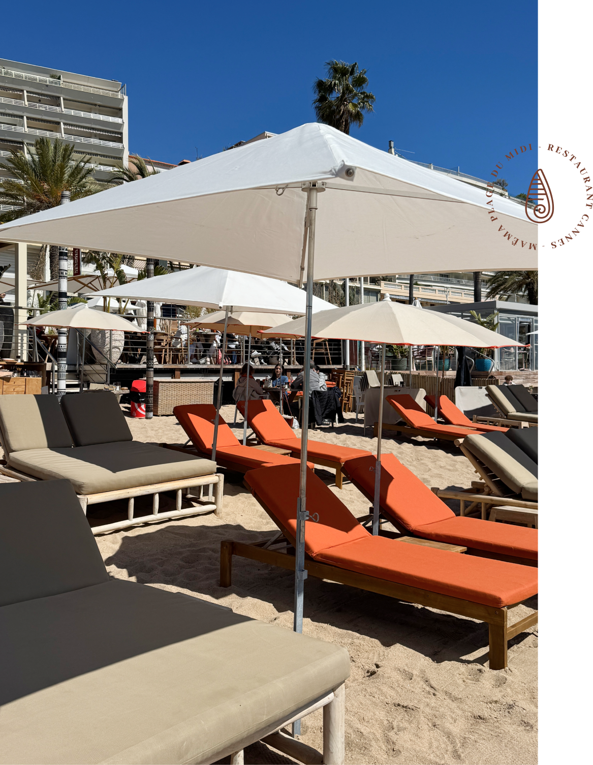 Profitez pleinement du soleil de la Côte d’Azur sur la plage privée Cannes de Maëma Plage du Midi, un véritable havre de détente au bord de l’eau. Installée sur la magnifique Plage du Midi, à quelques minutes du Suquet, du Vieux-Port de Cannes, du Marché Forville et de la célèbre Croisette, notre plage vous propose la location de transats confortables pour passer une journée inoubliable face à la Méditerranée. Allongez-vous sur votre matelas de plage, laissez-vous bercer par le bruit des vagues et profitez d’un service attentif pour savourer boissons fraîches, cocktails et spécialités du restaurant directement depuis votre transat.